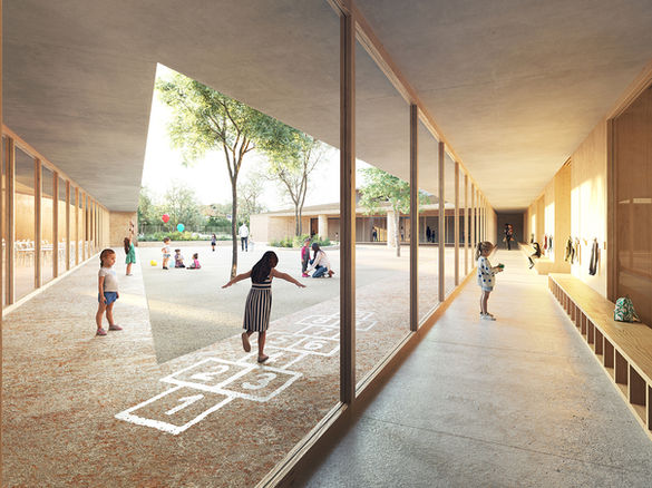 L’école se développe de plain-pied dans quatre entités principales réunies sous un toit commun qui étreint la cour d’école. Chaque fonction du programme revêt des qualités de volume, de lumière et d’ambiance adaptées à ses usages. Les espaces d’accueil et le périscolaire, ouverts sur le jardin public, constituent la porte d’entrée de l’école. Les dortoirs à l’ouest, à l’écart, et la bibliothèque sous le toit. Le restaurant, accessible directement depuis le jardin, qui s’ouvre largement sur la cour. Les classes au nord, mises à distance de la rue par le canal, qui profitent d’une lumière généreuse et homogène, et offrent des vues contrôlées sur l’eau, le calvaire et le ciel.